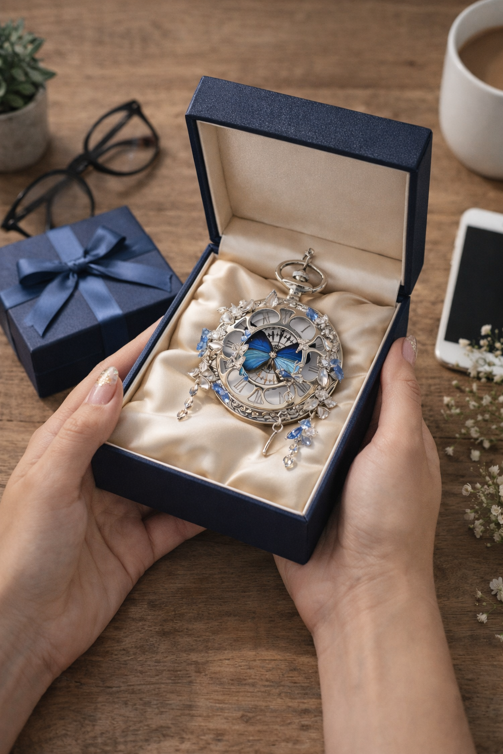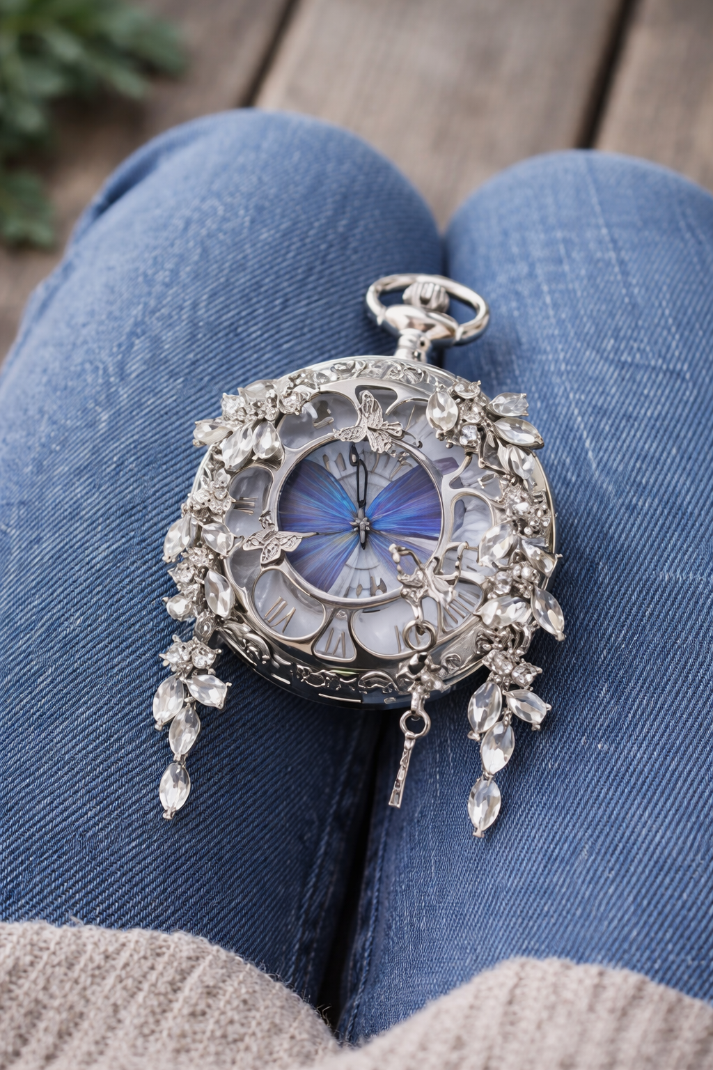 Each butterfly pocket watch is carefully assembled, polished, and crystal-set in-house, then inspected so every detail shines perfectly ✨
