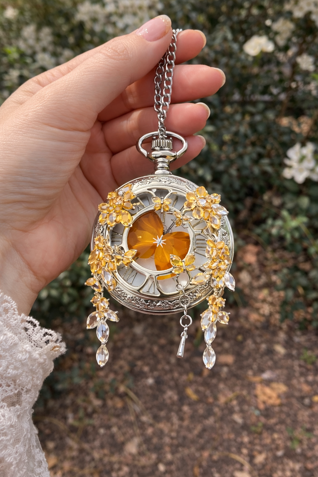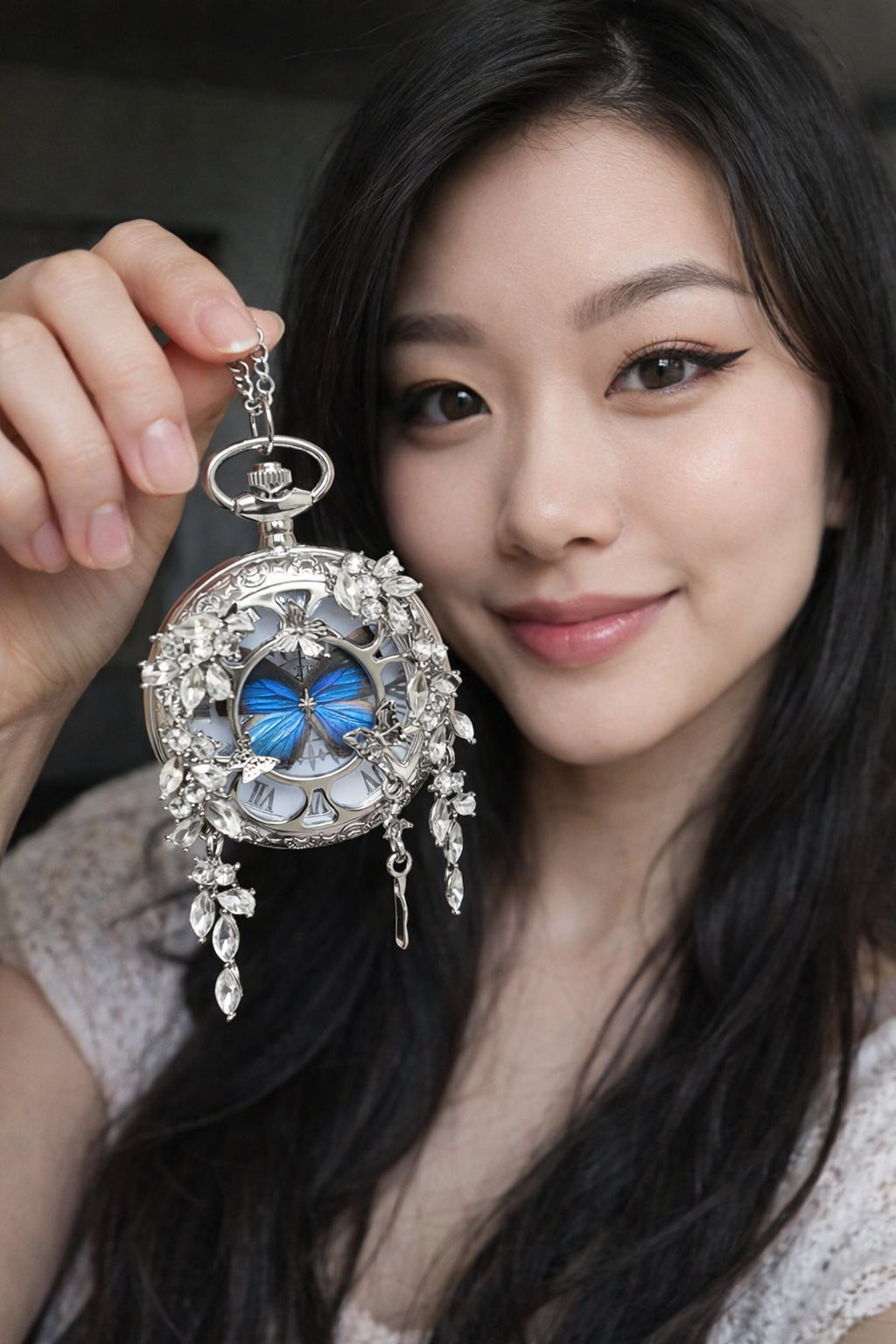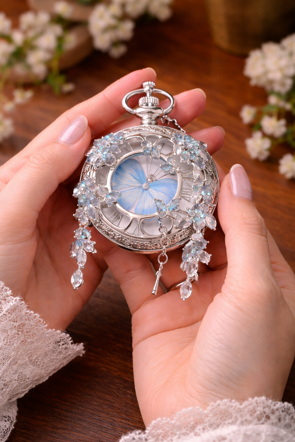 A luxurious pocket watch designed to turn heads — featuring an elegant butterfly centerpiece and dazzling crystal details that feel truly one-of-a-kind.